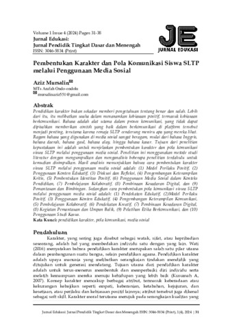 Pendidikan karakter bukan sekadar memberi pengetahuan tentang benar dan salah. Lebih dari itu, itu melibatkan usaha dalam menanamkan kebiasaan positif, termasuk kebiasaan berkomunikasi. Bahasa adalah alat utama dalam proses komunikasi, yang tidak dapat dipisahkan memberikan contoh yang baik dalam berkomunikasi di platform tersebut menjadi penting, terutama karena remaja SLTP cenderung meniru apa yang mereka lihat. Ragam bahasa yang digunakan di media sosial sangat beragam, mulai dari bahasa Inggris, bahasa daerah, bahasa gaul, bahasa alay, hingga bahasa kasar. Tujuan dari penelitian kepustakaan ini adalah untuk menjelaskan pembentukan karakter dan pola komunikasi siswa SLTP melalui penggunaan media sosial. Penelitian ini menggunakan metode studi literatur dengan mengumpulkan dan menganalisis beberapa penelitian terdahulu untuk kemudian disimpulkan. Hasil analisis menunjukkan bahwa cara pembentukan karakter siswa SLTP melalui penggunaan media sosial adalah: (1) Model perilaku positif, (2) Penggunaan konten edukatif, (3) Diskusi dan refleksi, (4) Pengembangan keterampilan kritis, (5) Pembentukan identitas positif, (6) Penggunaan media sosial dalam konteks pendidikan, (7) Pembelajaran kolaboratif, (8) Pembinaan kesadaran digital, dan (9) Pemantauan dan bimbingan. Sedangkan cara pembentukan pola komunikasi siswa SLTP melalui penggunaan media sosial adalah: (1) Pendekatan edukatif, (2) Model perilaku positif, (3) Penggunaan konten edukatif, (4) Pengembangan keterampilan komunikasi, (5) Pembelajaran kolaboratif, (6) Pendekatan kreatif, (7) Pembinaan kesadaran digital, (8) Kegiatan pemantauan dan umpan balik, (9) Pelatihan etika Berkomunikasi, dan (10) Penggunaan studi kasus.