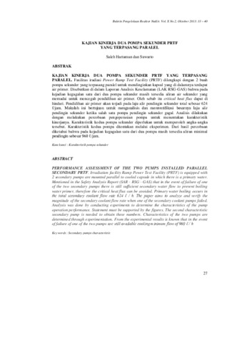 KAJIAN KINERJA DUA POMPA SEKUNDER PRTF YANG TERPASANG PARALEL. Fasilitas iradiasi Power Ramp Test Facility (PRTF) dilengkapi dengan 2 buah pompa sekunder yang terpasang paralel untuk mendinginkan kapsul yang di dalamnya terdapat air primer. Disebutkan di dalam Laporan Analisis Keselamatan (LAK RSG-GAS) bahwa pada kejadian kegagalan satu dari dua pompa sekunder masih tersedia aliran air sekunder yang memadai untuk mencegah pendidihan air primer. Oleh sebab itu critical heat flux dapat di hindari. Pendidihan air primer akan terjadi pada laju alir pendingin sekunder total sebesar 624 ℓ/jam. Makalah ini bertujuan untuk menganalisis dan memverifikasi besarnya laju alir pendingin sekunder ketika salah satu pompa pendingin sekunder gagal. Analisis dilakukan dengan melakukan percobaan pengoperasian pompa untuk menentukan karakteristik kinerjanya. Karakteristik kedua pompa sekunder diperlukan untuk memperoleh angka-angka tersebut. Karakteristik kedua pompa ditentukan melalui eksperimen. Dari hasil percobaan diketahui bahwa pada kejadian kegagalan satu dari dua pompa masih tersedia aliran minimal pendingin sebesar 960 ℓ/jam.