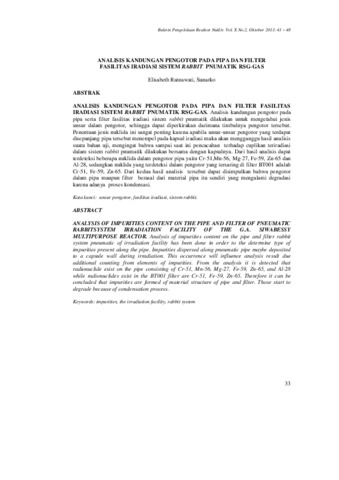 ANALISIS KANDUNGAN PENGOTOR PADA PIPA DAN FILTER FASILITAS IRADIASI SISTEM RABBIT PNUMATIK RSG-GAS. Analisis kandungan pengotor pada pipa serta filter fasilitas iradiasi sistem rabbit pnumatik dilakukan untuk mengetahui jenis unsur dalam pengotor, sehingga dapat diperkirakan darimana timbulnya pengotor tersebut. Penentuan jenis nuklida ini sangat penting karena apabila unsur-unsur pengotor yang terdapat disepanjang pipa tersebut menempel pada kapsul iradiasi maka akan mengganggu hasil analisis suatu bahan uji, mengingat bahwa sampai saat ini pencacahan terhadap cuplikan teriradiasi dalam sistem rabbit pnumatik dilakukan bersama dengan kapsulnya. Dari hasil analisis dapat terdeteksi beberapa nuklida dalam pengotor pipa yaitu Cr-51,Mn-56, Mg-27, Fe-59, Zn-65 dan Al-28, sedangkan nuklida yang terdeteksi dalam pengotor yang tersaring di filter BT001 adalah Cr-51, Fe-59, Zn-65. Dari kedua hasil analisis tersebut dapat disimpulkan bahwa pengotor dalam pipa maupun filter berasal dari material pipa itu sendiri yang mengalami degradasi karena adanya proses kondensasi.
