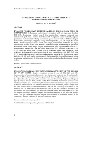 EVALUASI PELAKSANAAN IRADIASI SAMPEL DI RSG-GAS PADA TERAS 51 SAMPAI TERAS 60. Pelayanan iradiasi sampel merupakan salah satu tugas yang diemban RSG-GAS. Pelaksanaan iradiasi sampel bisa menimbulkan gangguan neutronik dan termohidrolik pada teras. Evaluasi dilakukan untuk mengetahui secara kualitatif pengaruh pelaksanaan iradiasi sampel terhadap keselamatan operasi reaktor. Evaluasi dilakukan dengan memilih lima jenis sampel yang paling sering diiradiasi yaitu TeO2, U-235, Sm2O3, Re-m dan MoO3. Parameter yang dievaluasi adalah jenis sampel, volume/berat, reaktivitas dan aspek termohidrolik sampel dalam teras. Evaluasi dilakukan dengan membandingkan parameter keselamatan untuk setiap sampel dengan batasan-batasan yang diperbolehkan dalam LAK masing-masing sampel dan LAK RSG-GAS. Reaktivitas TeO2 -0,0066%, reaktvitas U-235 0,2%, reaktivitas Sm2O3 dan Renium 0,031%, reaktivitas MoO3 bisa diabaiakan. Nilai reaktivitas kelima sampel tersebut masih dibawah batas yang diijinkan LAK RSG-GAS yaitu 0,5%. Integritas kelima sampel masih terjaga karena suhu sampel ketika di dalam teras masih jauh dibawah titik leleh masing-masing sampel. Dari evaluasi ini diperoleh kesimpulan bahwa pelaksanaan iradiasi sampel di dalam teras reaktor tidak membahayakan keselamatan operasi reaktor.
