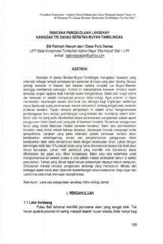 Kawasan tri danau Beratan-Buyan- Tamblingan merupakan kawasan yangpotensial sebagai tempat pariwisata dan pertanian di masa yang akan datang. Secara geologi kawasanini berasal dari tekanan kaldera komplek tua Buyan--Beratansehingga membentuk cekungan. Kondisi ini menyebabkan kawasan tersebut rawan terhadap longsor apabila tidak hati-hati dalam mengelolanya. Salah satu tungsi utama dari kawasan ini adalah mempunyai peranan hidro-orologi. Agar potensi ini dapatmemberikan keuntungan secara ekonomis dan ekologis bagi lingkungan sekitarnya maka diperlukan suatu perencanaan secara menyeluruh tentang pengelolaan kawasan tri-danau tersebut. Tujuan rencana pengelolaanini adalah untuk mengakomodasipembangunan baru melalui perlindungan ruang terbuka dan melindungi sistem alam.Salah satu hal yang perlu diperhatikan dalam perencanaan pengelolaan adalah aspek penggunaan lahan (land use) yang ada di kawasan tersebut. Penentuan penggunaan lahan yang cocok dilakukan melalui penilaian lansekap. Salah satu permasalahan lansekap yang dinilai adalah bahaya lansekap (landscape hazard mengingat kodisi geografisnya. Langkah yang perlu dilakukan adalah pemetaan kembali lahan berdasarkan kemiringannya, zonasi dan pengelompokan penggunaan lahan berdasarkan tabel kelas kemampuan lahan dengan kesesuaian lahan. Lahan dengan kemiringan lebih dari 15% adalah lahan yang harus dikonservasi karena bila tidak akan timbul kerusakan. Lahan milk penduduk yang memiliki nilai konservasi harus dibebaskan dari pajak atau diberi kompensasi. Salah satu cara sederhana untuk mengkonservasi air setelah proses di alas adalah melalui pembuatan taman di sekitar pemukiman. Taman yang dibuat dapat berupa pekarangan ataupun kebun campuran Diharapkan melalui rencana pengelolaanlansekap yang menyeluruh ditinjau dariberbagai aspek maka akan diperoleh keseimbangan antara kelestarian lingkungan dan usaha manusia untuk mencapai kesejahteraan.
