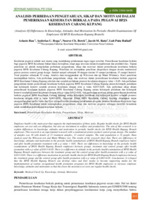 Kesehatan pegawai adalah aset utama yang mendukung pelaksanaan tugas-tugas tersebut. Pemeriksaan kesehatan berkala bagi pegawai BPJS Kesehatan bukan hanya kewajiban, tetapi juga investasi dalam kesejahteraan dan produktivitas. Tujuan penelitian ini adalah menjelaskan perbedaan pengetahuan, sikap dan motivasi dalam pemeriksaan kesehatan berkala pegawai BPJS Kesehatan Cabang Kupang. Penelitian ini merupakan penelitian eksperimen dengan desain randomized pretest posttest control group design. Jumlah sampel sebanyak 30 dengan rincian 15 sampel perlakuan, 15 sampel kontrol.Total populasi sebanyak 52 orang. Analisis data menggunakan uji Wilcoxon dan uji Mann Whitnney. Hasil penelitian menunjukkan bahwa, Ada perbedaan pengetahuan, sikap, dan motivasi dalam pemeriksaan kesehatan berkala pegawai BPJS Kesehatan Cabang Kupang sebelum dan sesudah perlakuan promosi kesehatan dengan p value < 0,05, Ada perbedaan pengetahuan dalam pemeriksaan kesehatan berkala pegawai BPJS Kesehatan Cabang Kupang antara kelompok perlakuan dan kelompok kontrol sesudah promosi kesehatan dengan nilai p value 0,033<0,05, Ada perbedaan sikap dalam pemeriksaan kesehatan berkala pegawai BPJS Kesehatan Cabang Kupang antara kelompok perlakuan dan kelompok kontrol sesudah promosi kesehatan dengan nilai p value 0,012<0,05, Ada perbedaan motivasi dalam pemeriksaan kesehatan berkala pegawai BPJS Kesehatan Cabang Kupang antara kelompok perlakuan dan kelompok kontrol sesudah promosi kesehatan dengan nilai p value 0,003<0,05. Simpulan: Pihak BPJS Kesehatan Cabang Kupang diharapkan dapatmengembangkan media video dan flyer menjadi media penunjang pelaksanaan program promosi kesehatan kerja rutin bagi pegawai BPJS Kesehatan untuk meningkatkan pengetahuan, sikap dan motivasi pegawai sehingga memiliki kesadaran untuk melakukan pemeriksaan kesehatan berkala.