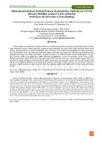 Debora, Vivia Kusumawardani and Elty, Sarvia (2024) Memahami durasi konsentrasi mahasiswa: implikasi untuk desain pembelajaran yang efektif studi kasus di Universitas X, Kota Bandung. In: Prosiding Seminar Nasional Perhimpunan Ergonomi Indonesia (PEI), 8-9 Agustus 2024, Bandung.