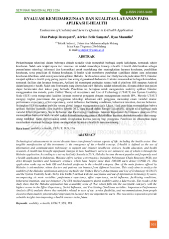Perkembangan teknologi dalam beberapa dekade terakhir telah mengubah berbagai aspek kehidupan, termasuk sektor kesehatan. Salah satu wujud nyata dari investasi ini adalah munculnya konsep e-health. E-health didefinisikan sebagai pemanfaatan teknologi informasi dan komunikasi untuk mendukung dan meningkatkan layanan kesehatan, pendidikan kesehatan, serta penelitian di bidang kesehatan. E-health telah membawa perubahan signifikan dalam cara pelayanan kesehatan diberikan, salah satunya melalui aplikasi Halodoc. Berdasarkan survei dari Daily Sociola pada tahun 2019, Halodoc menjadi aplikasi e-health yang paling populer dan sering digunakan di Indonesia. Halodoc menawarkan berbagai kemudahan, termasuk fasilitas dan layanan homecare,.Aplikasi ini menempati peringkat teratas baik di platform iOS maupun Android dalam kategori e-health. Salah satu fitur utama yang ditawarkan oleh Halodoc adalah telemedicine, di mana dokter dan pasien dapat berinteraksi dari lokasi yang berbeda. Penelitian ini bertujuan untuk menganalisis usability aplikasi Halodoc menggunakan dua metode, yaitu Unified Theory of Acceptance and Use of Technology (UTAUT) dan System Usability Scale (SUS) serta mengetahui kualitas layanan menurut pengguna dengan menggunakan metode IPA. Metode UTAUTmenguji tingkat penerimaan dan penggunaan teknologi informasi oleh pengguna, mencakup enam variabel utama:performance expectancy, effort expectancy, social influence, facilitating conditions, behavioral intention, dan use behavior.Sedangkan SUS mengukur usability secara global dengan menggunakan skala Likert. Hasil penelitian menunjukkan bahwa aplikasi Halodoc memiliki skor usability sebesar 76.2, yang masuk dalam kategori acceptable, dengan nilai tertinggi pada variabel Effort Expectancy, Social Influence, dan Facilitating Conditions. Analisis Importance-Performance Analysis (IPA) menunjukkan bahwa variabel-variabel terkait kemudahan penggunaan, fleksibilitas layanan, dan rekomendasi dari orangoran terdekat harus diprioritaskan untuk ditingkatkan karena penting bagi pengguna. Penelitian ini diharapkan dapat memberikan wawasan berharga dalam meningkatkan layanan e-health di masa mendatang.