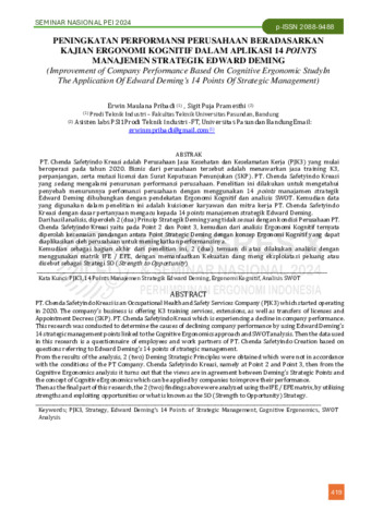 Erwin, Maulana Pribadi and Sigit, Puja Pramesthi (2024) Peningkatan performansi perusahaan beradasarkan kajian ergonomi kognitif dalam aplikasi 14 points manajemen strategik Edward Deming. In: Prosiding Seminar Nasional Perhimpunan Ergonomi Indonesia (PEI), 8-9 Agustus 2024, Bandung.