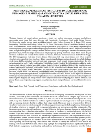Tinjauan literatur ini mengeksplorasi pentingnya visual cues dalam merancang perangkat pembelajaran matematika untuk siswa Tuli, yang didorong oleh Sustainable Development Goals milik United Nations.Meskipun ada mandat hukum untuk pendidikan inklusif, yaitu Undang-Undang No. 8 Tahun 2016 tentangPenyandang Disabilitas dan Undang-Undang No. 20 Tahun 2003 tentang Sistem Pendidikan Nasional, banyak siswa Tuli di Indonesia masih menghadapi tantangan pendidikan yang signifikan akibat perangkat pembelajaran dan strategi pengajaran yang tidak memadai yang gagal memenuhi kebutuhan unik mereka. Tinjauan ini bertujuan untuk menyelidiki bagaimana berbagai struktur informasi visual dalam perangkat pembelajaran mempengaruhi performa belajar, terutama dengan menekankan integrasi prinsip-prinsip pemberian sinyal dalam materi dengan informasi ekstrinsik dan konsep abstrak seperti Matematika. Pencarian literatur dilakukan dari Februari hingga Mei 2024 menggunakan basis data Scopus, dengan fokus pada studi yang terkait dengan teori beban kognitif, visual attention, dan efektivitas visual cues dalam perangkat pembelajaran multimedia untuk siswa Tuli. Delapan studi utama dipilih, mencakup berbagai kombinasi rangsangan visual, seperti: implementasi animasi dan teks melalui augmented reality (AR); implementasi video bahasa isyarat, gambar, dan teks dengan pendekatan statis; implementasi animasi (gambar bergerak), gambar, dan teks dengan pendekatan dinamis; dan tinjauan literatur tentang implementasi animated pedagogical agent (APA), pemberian cues dengan panah atau arrow, dan pemberian cues dengan warna. Studi-studi ini dianalisis untuk mengidentifikasi dampak visual cues pada performa belajar siswa Tuli. Temuan menunjukkan bahwa mengintegrasikan visual cues secara signifikan meningkatkan keterlibatan, pemahaman, dan performa akademik siswa Tuli. Namun, masih diperlukan penelitian lebih lanjut untuk menentukan kombinasi optimal visual cues dalam konteks statis dan dinamis untuk menghindari beban kognitif. Tinjauan ini mengadvokasi bahwa adopsi komunikasi visual yang jelas, elemen interaktif, dan prinsip desain yang berpusat pada pengguna sangat penting dalam mengembangkan alat pendidikan untuk siswa Tuli.