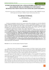 Penelitian ini mengeksplorasi potensi intervensi ergonomi dalam aplikasi pembelajaran basa bali (BALI-MOBAPP) dengan menggunakan pendekatan antarmuka pengguna (User Interface) dan pengalaman pengguna (User Experience) disingkat UI/UX untuk meningkatkan hasil belajar mahasiswa. Studi ini bertujuan untuk mengidentifikasi elemen-elemen ergonomi yang dapat diterapkan dalam desain aplikasi (BALI-MOBAPP) dan menganalisis dampaknya terhadap pembelajaran basa bali Bali. Hasil penelitian menunjukkan bahwa integrasi prinsip ergonomi dalam UI/UX aplikasi pembelajaran dapat meningkatkan keterlibatan dan efektivitas pembelajaran mahasiswa. Kenyamanan sebagai intervensi ergonomi dalam aplikasi pembelajaran memiliki peran yang krusial dalam meningkatkan pengalaman pengguna dan efektivitas pembelajaran meliputi : (a) Antarmuka pengguna yang intuitif, (b) Preferensi Pengguna (c) Distorsi, (d) Responsif dan (e) Pengelolaan beban kognitif. Metode penelitian yang dilakukan adalah menggunakan metode randomized pre and posttest control group design (Pocock, 2008). Penelitian ini adalah melibatkan kelompok kontrol menggunakan aplikasi konvensional dan kelompok perlakuan menggunakan aplikasi (BALI-MOBAPP). Penelitian ini menghasilkan (a) Pengujian subjek penelitian ke-dua kelompok mempunyai karakteristik subyek yang sama / homogen. (b) Karakteristik lingkungan tempat uji ke dua tempat memiliki suhu, kelembaban, kecepatan angin, pencahayaan tidak berbeda, (c) Pengujian kenyamanan dan hasil belajar menunjukan pengukuran kenyamanan kelompok kontrol lebih kecil dari pengukuran kelompok perlakuan yaitu 3,20 dan 4,25 atau terjadi peningkatan 32,69%. Peningkatan beban kerja akhir kelompok kontrol sebesar 12,32% sedangkan untuk kelompok perlakuan sebesar 5,54%. Terjadi peningkatan beban kerja akhir lebih tinggi pada kelompok kontrol dibandingkan kelompok perlakuan sebesar 16,13%. Hasil belajar kelompok kontrol sebesar 62,97 dan 73,12 untuk kelompok perlakuan, atau terjadi peningkatan sebesar 16,13%, jika bekerja dengan aplikasi (BALI-MOBAPP).