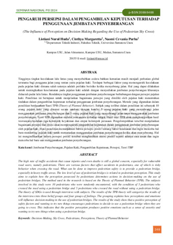 Listiani, Nurul Huda and Cinthya, Margaretta and Naomi, Cevania Purba (2024) Pengaruh persepsi dalam pengambilan keputusan terhadap penggunaan jembatan penyeberangan. In: Prosiding Seminar Nasional Perhimpunan Ergonomi Indonesia (PEI), 8-9 Agustus 2024, Bandung.