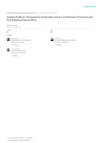 Rudiyanto, Rudiyanto and Darda, Efendi and Tri, Muji Ermayanti (2014) Somatic embryo germination of Jatropha curcas L in presence of sucrose and Poly Ethylene Glycol (PEG). Annales Bogorienses, 18 (1). pp. 35-43. ISSN 2407-7518