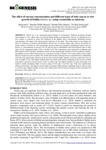 Rudiyanto, Rudiyanto and Betalini, Widhi Hapsari and Deritha, Ellfy Rantau and Tri, Muji Ermayanti (2022) The effect of sucrose concentrations and different types of tube cap on in vitro growth of Dahlia (Dahlia sp.) using vermiculite as substrate. Biogenesis, 10 (2). pp. 215-244. ISSN 2580-2909