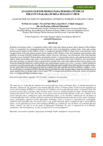 Penelitian ini bertujuan untuk: (1) mengetahui analisis faktor risiko pada pekerja pembuat piranti upakara di Desa Peliatan Ubud; (2) mengetahui dan mengimplementasikan alternatif solusi yang ditawarkan terhadap faktor risiko pada pekerja pembuat piranti upakara di Desa Peliatan Ubud; (3) mengetahui gambaran IPTEKS sebagai solusi yang ditawarkan untuk mengatasi faktor risiko pada pekerja pembuat piranti upakara di Desa Peliatan Ubud. Jenis penelitian yang digunakan pada penelitian ini berupa deskriptif eksploratif dengan metode observasi, wawancara, dan dokumentasi. Data yang diperoleh dinarasikan secara deskriptif. Hasil penelitian menunjukkan bahwa: (1) permasalahan prioritas pada pekerja pembuat piranti upakara adalah permasalahan pada aspek sosial kemasyarakatan, permasalahan pada aspek manajemen, dan permasalahan pada aspek produksi; (2) alternatif solusi yang ditawarkan terhadap faktor risiko pada pekerja pembuat piranti upakara yaitu berupa pemberdayaan masyarakat melalui pelatihan dan pendampingan tentang socio-culture ergonomic melalui pendekatan partisipatori yang berorientasi pada Teknologi Tepat Guna diharapkan dapat menjadi solusi untuk memecahkan permasalahan prioritas pada aspek sosial kemasyarakatan, aspek manajemen, dan aspek produksi secara komprehensif, bermakna, tuntas, dan berkelanjutan; (3) gambaran IPTEKS sebagai solusi yang ditawarkan untuk mengatasi faktor risiko pada pekerja pembuat piranti upakara yaitu: (a) mengacu pada 6 (enam) kajian TTG; (b) mengacu pada perbaikan mekanisme, stasiun, dan peralatan kerja; (c) mengacu perbaikan manajemen kerja.