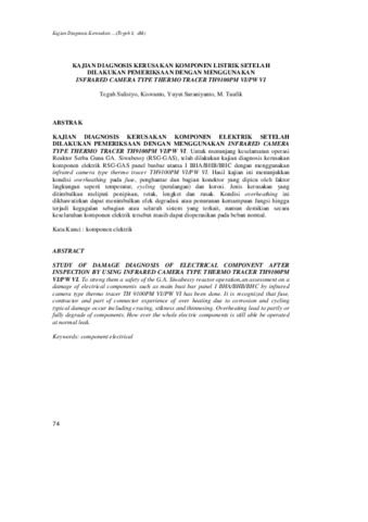 KAJIAN DIAGNOSIS KERUSAKAN KOMPONEN ELEKTRIK SETELAH DILAKUKAN PEMERIKSAAN DENGAN MENGGUNAKAN INFRARED CAMERA TYPE THERMO TRACER TH9100PM VI/PW VI. Untuk menunjang keselamatan operasi Reaktor Serba Guna GA. Siwabessy (RSG-GAS), telah dilakukan kajian diagnosis kerusakan komponen elektrik RSG-GAS panel busbar utama I BHA/BHB/BHC dengan menggunakan infrared camera type thermo tracer TH9100PM VI/PW VI. Hasil kajian ini menunjukkan kondisi overheathing pada fuse, penghantar dan bagian konektor yang dipicu oleh faktor lingkungan seperti temperatur, cycling (perulangan) dan korosi. Jenis kerusakan yang ditimbulkan meliputi penipisan, retak, lengket dan rusak. Kondisi overheathing ini dikhawatirkan dapat menimbulkan efek degradasi atau penurunan kemampuan fungsi hingga terjadi kegagalan sebagian atau seluruh sistem yang terkait, namun demikian secara keseluruhan komponen elektrik tersebut masih dapat dioperasikan pada beban normal.