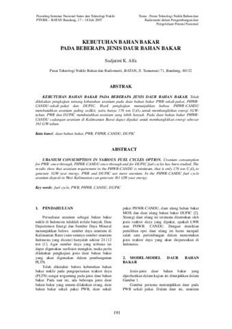KEBUTUHAN BAHAN BAKAR PADA BEBERAPA JENIS DAUR BAHAN BAKAR. Telah dilakukan pengkajian tentang kebutuhan uranium pada daur bahan bakar PWR-sekali-pakai, PHWR-CANDU-sekali-pakai dan DUPIC. Hasil pengkajian menunjukkan bahwa PHWR-CANDU membutuhkan uranium paling sedikit, yaitu hanya 176 ton U3O8 untuk membangkitkan energi 1GW-tahun. PWR dan DUPIC membutuhkan uranium yang lebih banyak. Pada daur bahan bakar PHWR-CANDU cadangan uranium di Kalimantan Barat dapat dipakai untuk membangkitkan energi sebesar 161 GW-tahun.
