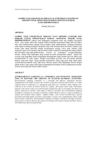 SAMPEL USAP LINGKUNGAN SEBAGAI ALAT DETEKSI CANGGIH DAN EFEKTIF UNTUK MENGUNGKAP BAHAN/ AKTIVITAS NUKLIR YANG DISEMBUNYIKAN. Sampel usap lingkungan merupakan salah satu tindakan safeguards IAEA yang sangat efektif dan canggih untuk mendeteksi keberadaan bahan/ aktivitas nuklir baik yang dideklarasikan maupun yang mungkin tidak dideklarasikan. Sehingga kepatuhan suatu negara terhadap perjanjian safeguards yang telah disetujui dapat dievaluasi. Sampel yang berupa debu dapat diperoleh dengan mengusapnya dengan cotton usap. Partikel yang menempel pada cotton dianalisa dan dievaluasi untuk mendeteksi kemungkinan adanya bahan/ aktivitas nuklir yang tidak dideklarasikan. Tulisan ini membahas/ mengintroduksikan metoda sampel usap lingkungan yang meliputi prosedur pengambilan sampel, analisa dan evaluasi yang digunakan untuk mengungkap kemungkinan adanya bahan/ aktivitas nuklir yang disembunyikan di suatu negara. Dengan menerapkan prosedur dan persyaratan jaminan kualitas yang ketat dapat dapat dihindari kontaminasi silang yang pada tahap lanjut dapat memberikan kesimpulan yang tidak benar. Metoda sampel usap lingkungan disertai dengan teknik analisis yang sangat maju dapat mengungkap keberadaan fasilitas pengkayaan uranium, fasilitas olah ulang dan fasilitas nuklir lainnya.