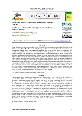 Rista, Nur Rahmaniah and Pawana, Nur Indah and Dita, Atasa (2024) Eksistensi & potensi usaha bunga sedap malam Kabupaten Pasuruan. Jurnal Agribest, 8 (2): 3. pp. 65-74. ISSN 2581-1339