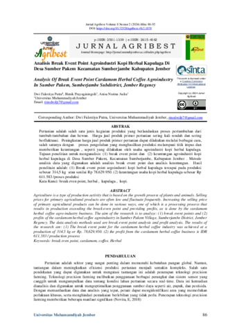 Dwi, Falestiya Putra and Henik, Prayuginingsih and Anisa, Nurina Aulia (2024) Analisis break event point agroindustri kopi herbal kapulaga di Desa Sumber Pakem Kecamatan Sumberjambe Kabupaten Jember. Jurnal Agribest, 8 (2): 5. pp. 86-92. ISSN 2581-1339