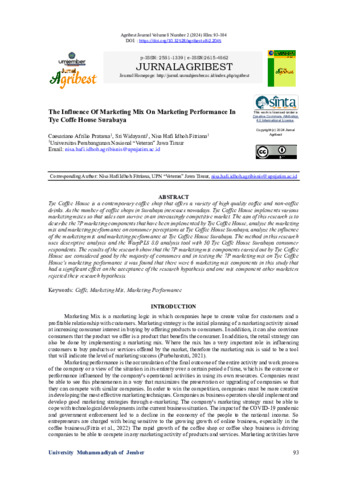Caesariano, Afrilio Pratama and Sri, Widayanti and Nisa, Hafi Idhoh Fitriana (2024) The influence of marketing mix on marketing performance in Tye Coffe House Surabaya. Jurnal Agribest, 8 (2): 6. pp. 93-104. ISSN 2581-1339