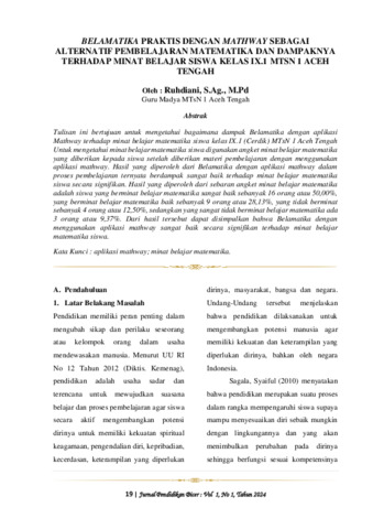Tulisan ini bertujuan untuk mengetahui bagaimana dampak Belamatika dengan aplikasi Mathway terhadap minat belajar matematika siswa kelas IX.1 (Cerdik) MTsN 1 Aceh Tengah Untuk mengetahui minat belajar matematika siswa digunakan angket minat belajar matematika yang diberikan kepada siswa setelah diberikan materi pembelajaran dengan menggunakan aplikasi mathway. Hasil yang diperoleh dari Belamatika dengan aplikasi mathway dalam proses pembelajaran ternyata berdampak sangat baik terhadap minat belajar matematika siswa secara signifikan. Hasil yang diperoleh dari sebaran angket minat belajar matematika adalah siswa yang berminat belajar matematika sangat baik sebanyak 16 orang atau 50,00%, yang berminat belajar matematika baik sebanyak 9 orang atau 28,13%, yang tidak berminat sebanyak 4 orang atau 12,50%, sedangkan yang sangat tidak berminat belajar matematika ada 3 orang atau 9,37%. Dari hasil tersebut dapat disimpulkan bahwa Belamatika dengan menggunakan aplikasi mathway sangat baik secara signifikan terhadap minat belajar matematika siswa.
