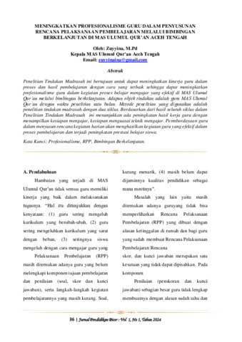 Zuyyina, Zuyyina (2024) Meningkatkan profesionalisme guru dalam penyusunan rencana pelaksanaan pembelajaran melalui bimbingan berkelanjutan di MAS Ulumul Qur’An Aceh Tengah. Jurnal Pendidikan Bicer: Berdedikasi, Intelektual dan Cerdas, 1 (1): 4. pp. 36-46. ISSN 3048-2828