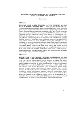 Slamet Wiranto, SW (2005) EVALUASI UMUR GARPU PENYERAP BATANG KENDALI RSG-GAS SETELAH BEROPERASI 30.000 MWD. Buletin "Reaktor". ISSN ISSN: 0216-2695