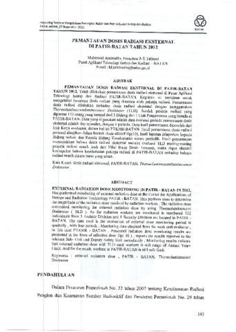 Aminudin, Muhammad and Tethool, Fransisca A.E. (2013) Pemantauan Dosis Radiasi External di PATIR-BATAN tahun 2012. In: Prosiding Seminar Pengelolaan Perangkat Nuklir dan Pemanfaatan Isotop dan Radiasi PATIR BATAN November 2013, 27 November 2013, Jakarta.