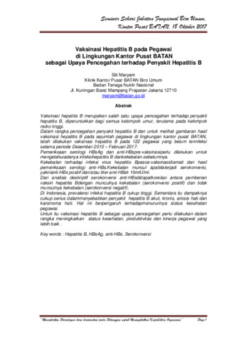 maryam, siti (2017) Vaksinasi Hepatitis B pada Pegaria di Lingkungan Kator Pusat BATAN sebagai Upaya Pencegahan terhadap Penyakit Hepatitis B. Working Paper. Biro Umum. (Unpublished)