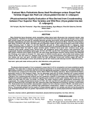 Yuriyah, Siti and Purwanto, Oky Dwi and Afza, Higa and Dadang, Ahmad and Masyuri, Agus and Galurina, Rina Siti and Utami, Dwinita Wikan (2024) Evaluasi Mutu Fisikokimia Beras Hasil Persilangan antara Empat Padi Varietas Unggul dan Padi Liar (Oryza glaberrima dan O. rufipogon). Jurnal Ilmu Pertanian Indonesia, 29 (3). pp. 397-407. ISSN 0853-4217