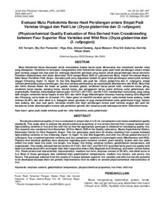 The physicochemical quality of rice is evaluated to ensure that it is fit for consumption and meets established quality standards. This study aims to analyze the physicochemical properties of rice strains resulting from crosses between four high-yielding varieties of rice and two wild rices so that the appropriate genotype is obtained for the development of quality rice. The research was conducted from November 2019 to March 2020 at the Quality Laboratory, Muara Experimental Garden, Rice Research Center, Bogor. The rice genotypes used were 22 strains resulting from crosses between high-yielding varieties of rice (Ciherang, Inpari 13, Inpari 10, and Situ Bagendit), and wild rice (Oryza glaberrima and O. rufipogon), 4 comparison varieties of crossbred elders, and two comparison varieties of organoleptic tests (Memberamo and IR42). Physical and chemical qualities were observed in terms of grain moisture content, grain density, broken skin rice yield, milled rice yield, head rice yield, rice length, rice shape, and rice liming, amylose content, gelatinization temperature, and organoleptic. The results showed that the strains 44-F-C21, 58-F-C21, and 59-F-C21 provided fairly good rice quality with head rice yields above 80% and higher than their respective elders (Situ Bagendit and Ciherang), and water content below 14%. These strains had characteristic characteristics, namely medium rice form, amylose content of 26.38%, and alkali score of 2-3. Most of these genotypes also exhibited high gelatinization temperatures, medium rice texture, and savory rice flavors. The genotype selected from the results of crosses between high-yielding varieties of rice and wild rice has the potential to be developed because there are genetic improvements from its elders on several physicochemical characteristics of rice.
