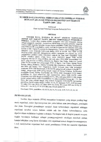 Sumberdaya manusia (SDM) merupakan salah satu komponen penting sebagai penggerak organisasi. Kemampuan SDM dalam mengelola persoalan langsung ataupun tidak langsung berkaitan dengan tingkat pendidikan SDM yang bersangkutan. Data SDM PATIR yang disajikan dalam makalah ini diperoleh dari dokumen aktif yang btercatat di Subbabg. Persuratan dan Kepegawaian.
