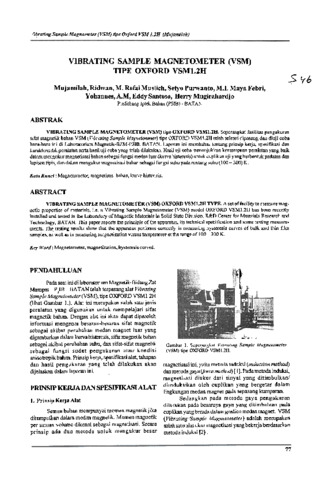 VIBRATING SAMPLE MAGNETOMETER (VSM) tipe OXFORD VSMl.2H. Seperangkat fasilitas pengukuran sifat magnetik bahan VSM (Vibrating Sample Magnetometer) tipe OXFORD VSMI.2H telah selesai dipasang dan diuji coba baru-baruini di Laboratorium Magnetik-BZM-P3IB, BAT AN. Laporan inimembahas tentang prinsip kerja, spesifikasi dan karakterisitik peralatan serta hasiluji coba yang telah dilakukan. Hasil uji coba menunjukkan kemampuan peralatan yang baik dalam mengukur magnetisasi bahan sebagai fungsi medan luar (kurva histeresis) untuk cuplikan uji yang berbentuk padatan dan lapisan tipis, dan dalam mengukur magnetisasi bahan sebagai fungsi suhu pacta rentang suhu (100 -300) K.