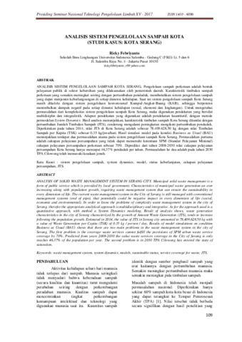 Febriyanto, Ricky (2017) ANALISIS SISTEM PENGELOLAAN SAMPAH KOTA (STUDI KASUS: KOTA SERANG). Seminar Nasional Teknologi Pengelolaan Limbah XV 2017.