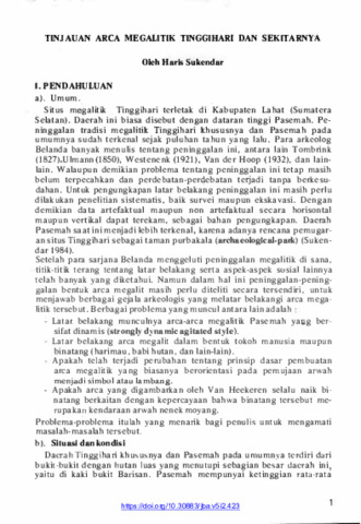 Situs megalitik, Tinggihari terletak di Kabupaten Lahat (Sumatera Selatan). Daerah ini biasa disebut dengan dataran tinggi Pasemah. Peninggalan tradisi megalitik Tinggihari khususnya dan Pasemah pada umumnya sudah terkenal sejak puluhan tahun yang lalu. Para arkeolog Belanda banyak menulis tentang peninggalan ini, antara lain. Tombrink (1827).Ulmann(1850), Westenenk (1921), Van der Hoop (1932), dan lainlain. Walaupuri demikian problema tentang peninggalan ini tetap masih belum terpeeahkan dan perdebatan-perqebatan terjadi tanpa berkesudahan. Untuk pengungkapan latar belakang peninggatan ini masih perlu dilakukan penelitian sistematis, baik survei maupun ekskavasi. Dengan demikian data artefaktual maupun non artefaktual secara horisontal maupun vertikal dapat terekam, sebagai bahan pengungkapan. Daerah Pasemah saat ini menjadi lebih terkenal, karena adanya reneana pemugaran situs Tinggihari sebagai taman purbakala (archaeological-park) (Sukendar 1984).