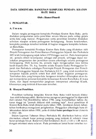 Dalam rangka pemugaran kompleks Pendapa Kraton Ratu Baka, perlu diadakan pengamatan serta penelitian secara khusus pada setiap gejala serta data yang muncul. Pengamatan serta penelitian tersebut dilakukan sebelum maupun selama pemugaran berlangsung. Secara keseluruhan, kompleks pendapa tersebut terletak di bagian tenggara kompleks kekunaan Ratu Baka. Pemugaran kompleks Pendapa Kraton Ratu Baka yang dilakukan oleh Proyek Pemugaran dan Pemeliharaan Peninggalan Sejarah dan Purbakala DIY telah berlangsung sejak tahun 1979 hingga saat ini. Pada kesempatan ini, penulis diberi kesempatan sebagai staf proyek, sehingga dapat melakukan pengamatan dan penelitian secara arkeologis selama pemugaran berlangsung. Oleh karena itu, penulis ingin mengucapkan rasa terima kasih kepada Drs. Th. Aq. Sunarto selaku Kepala Suaka Peninggalan Sejarah dan Purbakala sekaligus Pemimpin Proyek Pemugaran dan Pemeliharaan Peninggalan Sejarah dan Purbakala D.l.Y. yang telah memberi kesempatan kepada penulis untuk ikut aktif dalam kegiatan pemugaran. Tambahan data yang berupa data bangunan tersebut diharapkan akan dapat memperjelas peranan kompleks kekuanaan Kraton Ratu Baka di masa silam, dan dapat memperlebar jangkuan interpretasi arkeologi Klasik, khususnya yang terletak di kawasan tersebut.