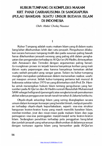 Nawawi, Abdul Choliq (1986) Kubur-Tumpang di Kompleks Makam Krt. Panji Cakrakusuma di Sangkapura (Pulau Bawean): Suatu Unsur Budaya Islam di Indonesia. Berkala Arkeologi, 7 (1): 5. pp. 56-69. ISSN 0216 - 1419