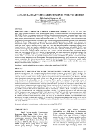 Sundari, Titik and Aji, Darmawan (2017) ANALISIS RADIOAKTIVITAS AIR PENDINGIN DI FASILITAS KH-IPSB3. Seminar Nasional Teknologi Pengelolaan Limbah XV 2017.