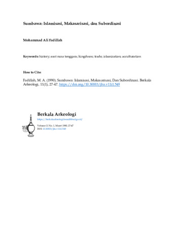 Fadillah, Mohammad Ali (1990) Sumbawa: Islamisasi, Makasarisasi, dan Subordinasi. Berkala Arkeologi, 11 (1): 3. pp. 27-47. ISSN 0216 - 1419