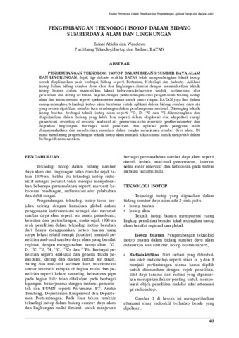 Sejak tiga dekade terakhir bATAN telah mengembangan Teknologi Isotop untuk diaplikasikan pada berbagai bidang seperti: pertanian, industri dan hidrologi. Aplikasi Isotop dalam bidang sumberdaya alam dan lingkungan dimulai dengan memanfaatkan teknik isotop buatan dalam menentukan lokasi kebocoran-kebocoran waduk, sedimentasi alur pelabuhan dan air tanah.