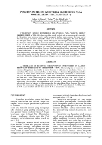 wortel yang telah diiradiasi dengan etil asetat dan ditentukan dengan Gas Kromatografi menggunakan detector FPD (Flame Photo Detector). Hasil menunjukkan bahwa penurunan insektisida dengan iradiasi sinar-γ pada dosis 0,5 kGy sebesar 33-70 %, dan pada dosis iradiasi 1,5 kGy dapat menurunkan kandungan residunya sebesar 24-70%, sedangkan pada dosis 1,0kGy dapat menurunkan residu klorpirifos dicapai antara 60-80%, ini terjadi pada perendaman dengan insektisida klorpirifos baik pada konsentrasi 100 ppm maupun pada konsentrasi 400 ppm.