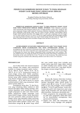 Telah dilakukan penelitian untuk menentukan nilai komposisi isotop D dan 18O dalam keadaan “steady state” sampel air dari panci penguapan dengan model optimasi. Penentuan dilakukan berdasarkan data penelitian dari