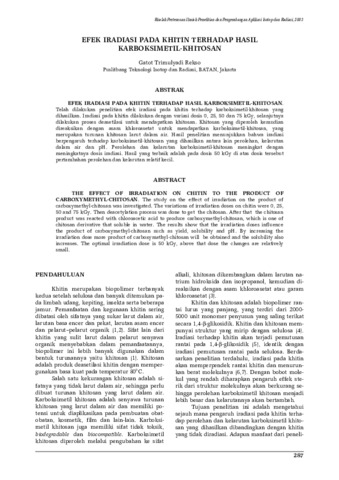 direaksikan dengan asam khloroasetat untuk mendapatkan karboksimetil-khitosan, yang merupakan turunan khitosan larut dalam air. Hasil penelitian menunjukkan bahwa iradiasi berpengaruh terhadap karboksimetil-khitosan yang dihasilkan antara lain perolehan, kelarutan dalam air dan pH. Perolehan dan kelarutan karboksimetil-khitosan meningkat dengan meningkatnya dosis iradiasi. Hasil yang terbaik adalah pada dosis 50 kGy di atas dosis tersebut pertambahan perolehan dan kelarutan relatif kecil.