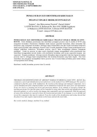 Sujatno, S and Ana Maisyarotun Nasitoh, AMN and Zaenal Abidin, ZA (2015) PENELUSURAN DAN IDENTIFIKASI KERUSAKAN PESAWAT SINAR-X MEDIK DI STTN-BATAN. In: SEMINAR NASIONAL XI SDM TEKNOLOGI NUKLIR YOGYAKARTA,, 15 SEPTEMBER 2015, Yogyakarta.
