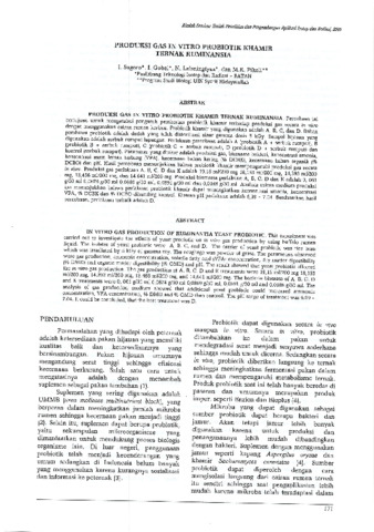 Percobaan ini bertujuan untuk mengetahui pemberian probiotik khamir terhadap produksi gas secara in vitro dengan menggunakan cairan rumen kerbau. Probiotik yang digunakan adalah A, B, C, dan D. Bahan pembawa probiotik adalah dedak yang disterilisasi sinar gamma dosis 5 kGy. Sampel hijauan yang digunakan adalah serbuk rumput lapangan.