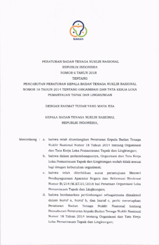 BHHK, BATAN and BSDMO, BATAN (2018) PERATURAN BADAN TENAGA NUKLIR NASIONAL REPUBLIK INDONESIA NOMOR 6 TAHUN 2018 TENTANG PENCABUTAN PERATURAN KEPALA BADAN TENAGA NUKLIR NASIONAL NOMOR 18 TAHUN 2014 TENTANG ORGANISASI DAN TATA KERJA LOKA PEMANTAUAN TAPAK DAN LINGKUNGAN. BHHK-BATAN, Jakarta.