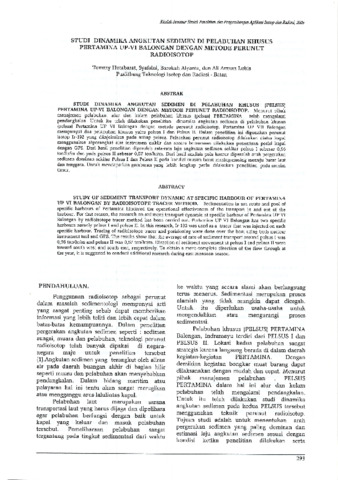Hutabarat, Tommy and Syafalni, Syafalni and Alyanta, Barokah and Lubis, Ali Arman (2005) Studi Dinamika Angkutan Sedimen di Pelabuhan Khusus (Pelsus) Pertamina UP-PI Balongan dengan Metode Perunut Radioisotop. In: Risalah seminar Ilmiah penelitian dan pengembangan Aplikasi Isotop dan Radiasi, 2005., 12 April 2005, Jakarta.