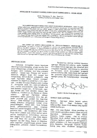 Dalam Rangka aplikasi Radiasi pada pengembangan bahan polimer alam khususnya yang berasal dari tumbuhan laut, telah dipelajari karakter fisiko-kimia agar-agar akibat pengaruh iradiasi gama pada dosis 0-50 kGy.