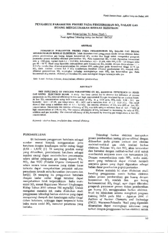 Suhartini, Meri and L., Tri Retno Dyah (2006) Pengaruh Parameter Proses pada Pembersihan SO2 dalam Gas Buang Menggunakan Berkas Elektron. In: Risalah seminar Ilmiah penelitian dan pengembangan Aplikasi Isotop dan Radiasi, 2006., 12 Desember 2006, jakarta.
