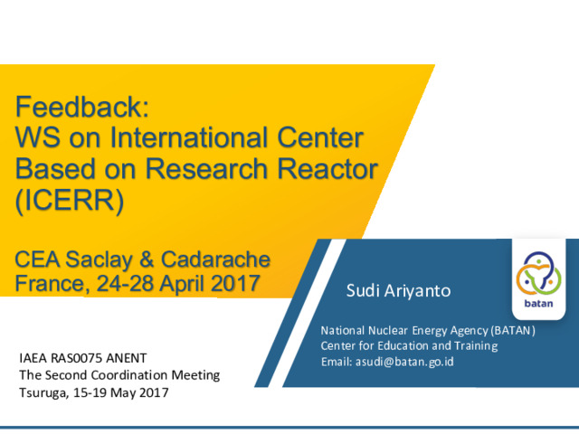 Ariyanto, Sudi (2017) Feedback: WS on International Center Based on Research Reactor (ICERR). In: Feedback: WS on International Center Based on Research Reactor (ICERR), France. (Unpublished)
