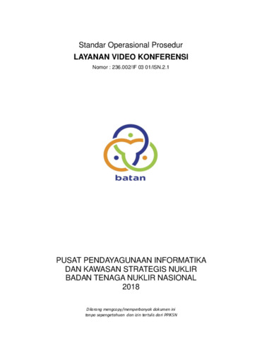 Junaidi, Junaidi and Suratman, Suratman (2018) Standar Operasional Prosedur LAYANAN VIDEO KONFERENSI Nomor : 236.002/IF 03 01/ISN.2.1. Pusat Pendayagunaan Informatika dan Kawasan Strategis Nuklir.