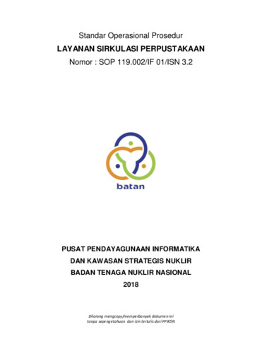 Rohandi Yusuf, Anggiana (2018) Standar Operasional Prosedur LAYANAN SIRKULASI PERPUSTAKAAN Nomor : SOP 119.002/IF 01/ISN 3.2. Pusat Pendayagunaan Informatika dan Kawasan Strategis Nuklir.