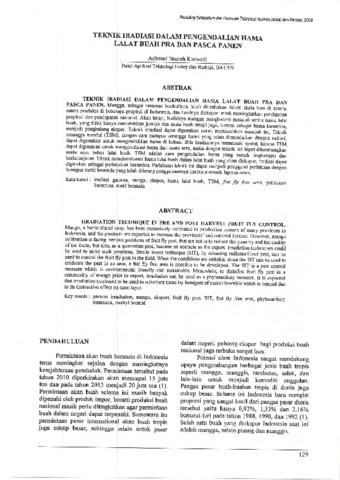 Mangga, sebagai tanaman hotikuitura, telah diusahakan dalam skala luas di sentra¬sentra produksi di beberapa propinsi di Indonesia, dan hasilnya diekspor untuk meningkatkan pendapatan propinsi dan pendapatan nasional. Akan tetapi, budidaya mangga menghadapi masalah serius hama lalat buah, yang tidak hanya menurunkan jumlah dan mutu buah tetapi juga, karena sebagai hama karantina, menjadi penghalang ekspor. Teknik irradiasi dapat digunakan untuk memecahkan masalah ini. Teknik serangga mandul (TSM), dengan cara melepas serangga hama yang telah dimandulkan dengan radiasi, dapat digunakan untuk mengendalikan hama di kebun. Bila kcadaannya memenuhi syarat, karena TSM dapat digunakan untuk rnengeradikasi hama dari suatu area, maka dengan teknik ini dapat dikembangkan suatu area bebas lalat buah. TSM adalah cara pengendalian hama yang ramah lingkungan dan berkelanjutan. Untuk mendisinfestesi hama lalat buah dalam lalat buah yang akan diekspor, iradiasi dapat diginakan sebagai perlakukan karantina. Perlakuan teknik ini dapat menjadi pengganti pcrlakuan dengan fumigasi metil brornida yang telah dilarang penggunaannya karena merusak lapisan ozon.